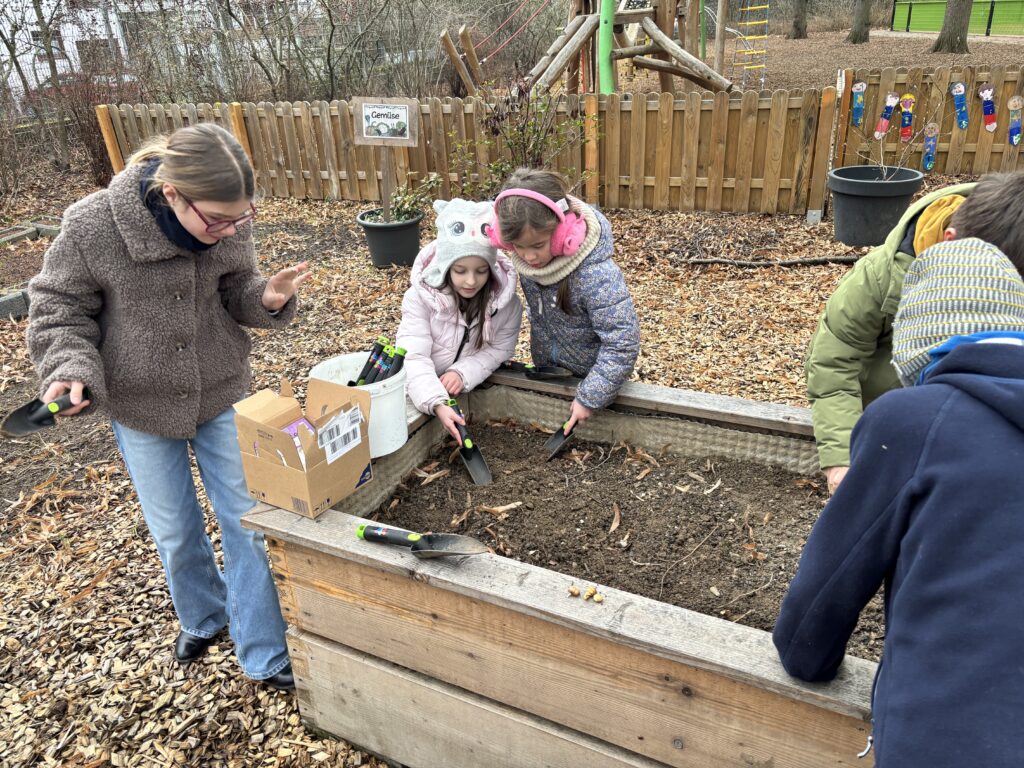 Im Schulgarten der Stirumschule war im Dezember einiges los. Vielleicht ist es bereits beim Wichtelmarkt aufgefallen: Die Firma Dickgießer Galabau war schon im November vor Ort und hat den Schulgarten erneut tatkräftig unterstützt. Auch das Tannenreisig, das für die weihnachtliche Dekoration auf dem Wichtelmarkt genutzt wurde, stellte die Firma zur Verfügung. Alle anfallenden Arbeiten, die die Kinder allein nicht hätten bewältigen können, wurden von den Mitarbeitenden übernommen. Dazu gehörten die komplette Laubentfernung, der Rückschnitt der Büsche, das Entfernen von Unkraut sowie das Auffüllen der Beete uvm. Dank dieser umfangreichen Pflege ist der Schulgarten bestens durch den Winter gekommen. Schon jetzt können sich die Kinder über die ersten Frühblüher freuen. Die Kinder der Bienen-AG sowie einige Kinder der Klasse 2c haben zusätzlich weitere Blumenzwiebeln gepflanzt, damit im Frühling nicht nur der Garten erblüht, sondern auch die ersten Insekten ein reiches Nahrungsangebot finden. Ein herzliches Dankeschön an die Firma Dickgießer Galabau für diese großartige und wertvolle Unterstützung des Schulgartens und damit auch der Arbeit mit unseren Kindern!