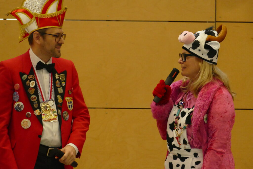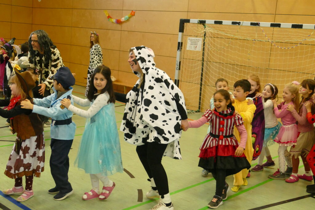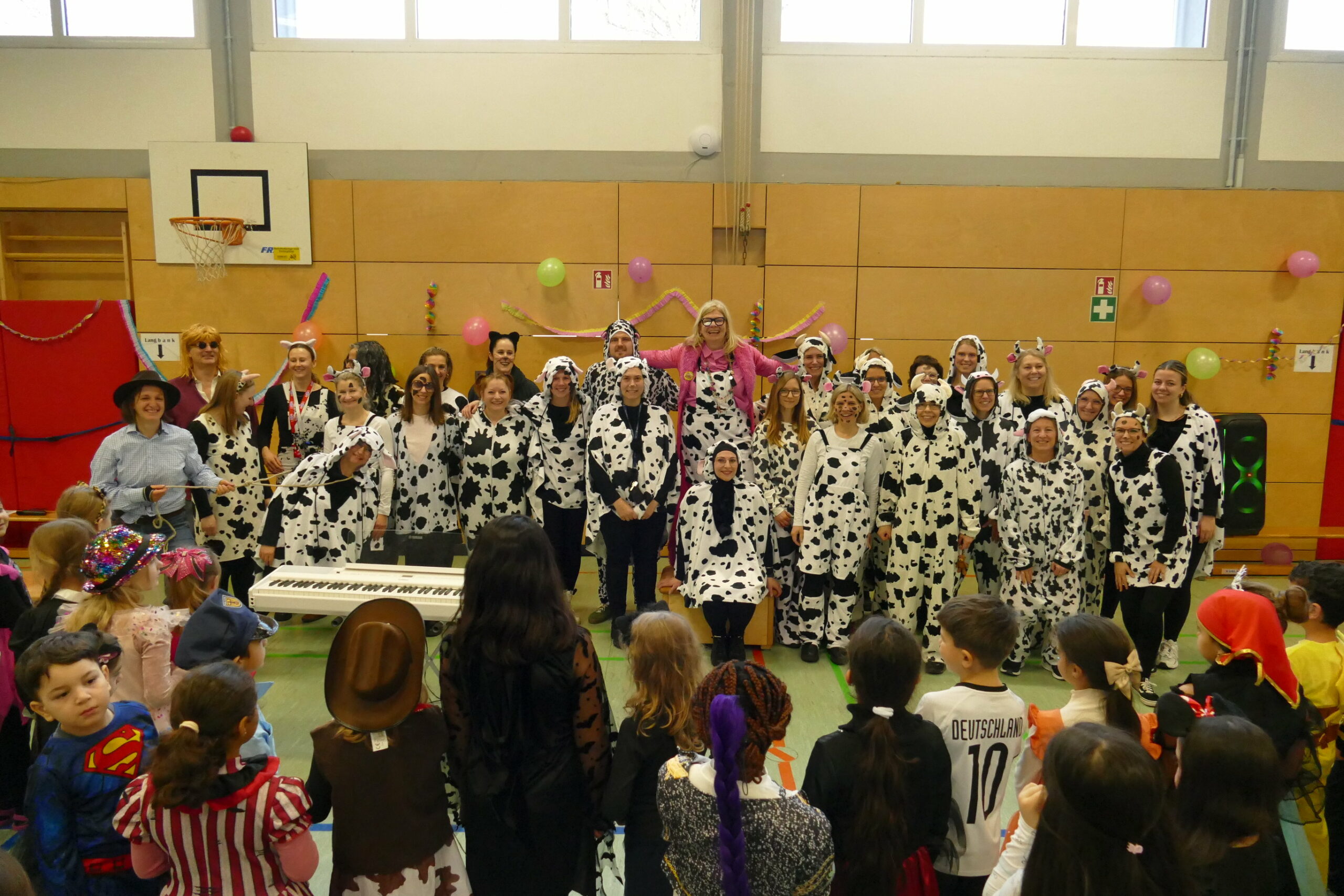 Für eine große Überraschung sorgte anschließend das Lehrerteam: Die Kolleginnen und Kollegen erschienen plötzlich alle im gleichen Kostüm – als fröhliche Kuhherde! Damit überraschten sie ihre Rektorin Frau Liane Blank, die ihr letztes Schuljahr an der Stirumschule verbringt und sowohl Fasching als auch Kühe ganz besonders liebt. Die Freude war groß und für alle ein riesiger Spaß.