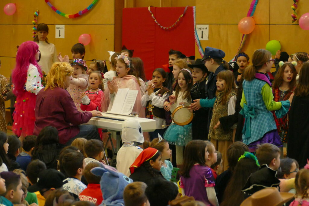 Zu fröhlicher Faschingsmusik wurde ausgelassen getanzt, gelacht und gefeiert. In den fantasievollen Kostümen – von Prinzessinnen über Superhelden bis hin zu lustigen Tieren – verwandelte sich die Sporthalle schnell in ein farbenfrohes Faschingskostümemeer.