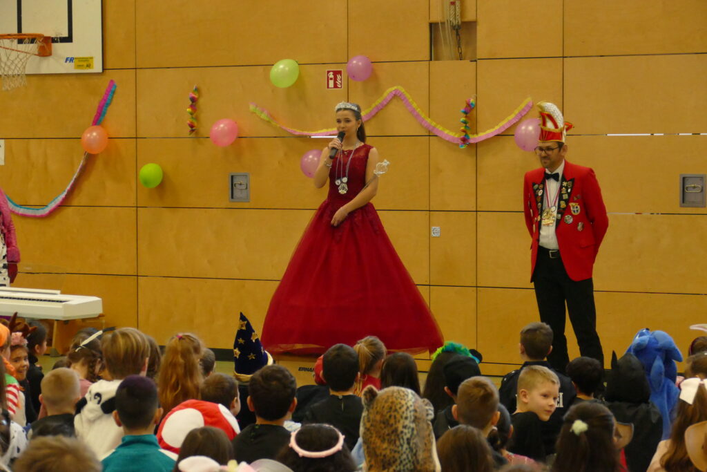 Ein besonderes Highlight war der Besuch der Faschingsprinzessin Fiona, die Zweite von der Gro Ka Ge. die vor der gesamten Schulgemeinschaft ihren Prolog vortrug. Vor allem die Mädchen bewunderten natürlich ihr wunderschönes Kleid und das funkelnde Krönchen.