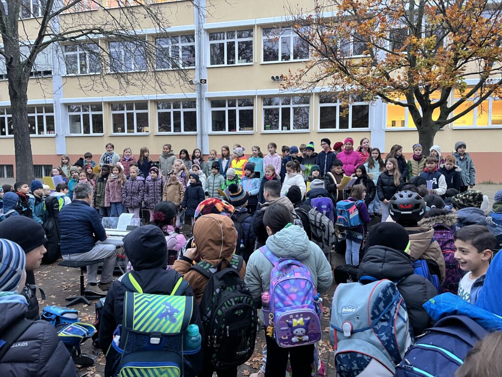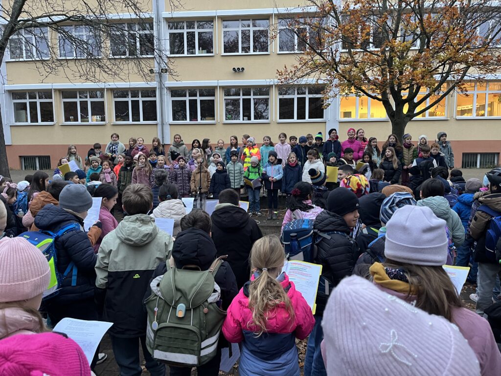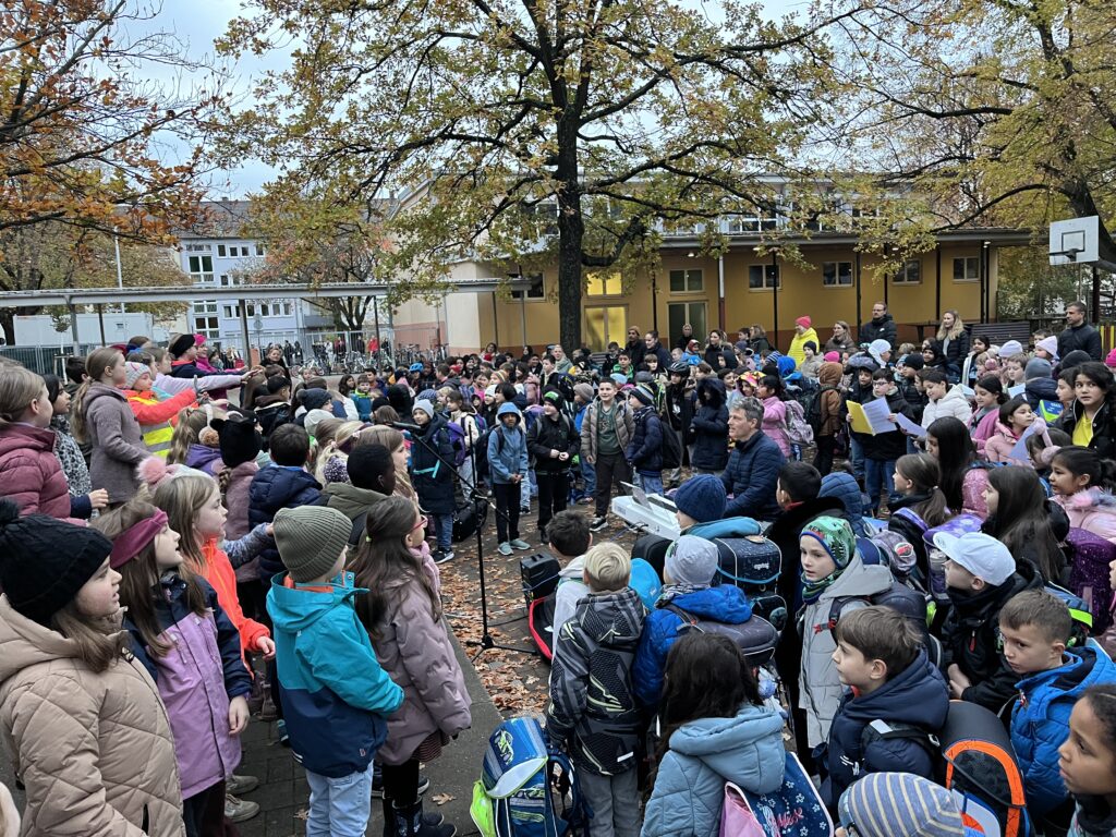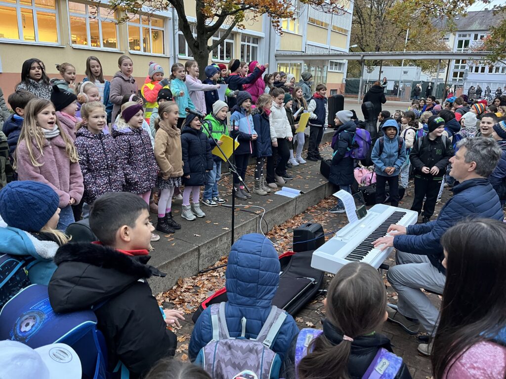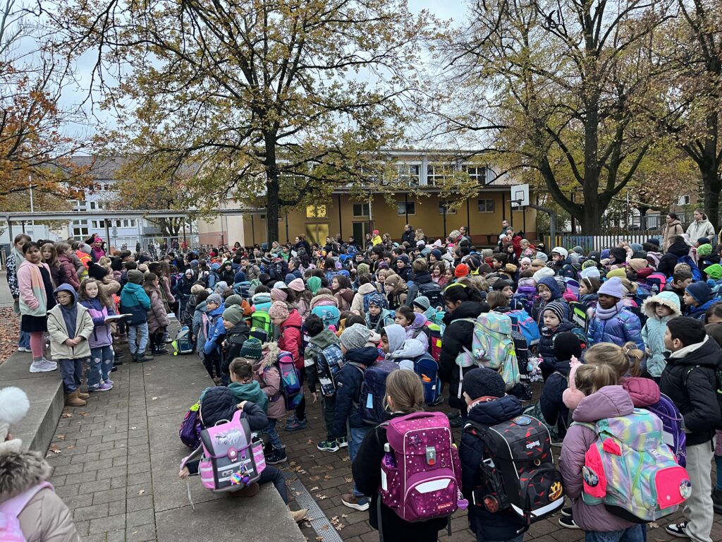 Am vergangenen Dienstag versammelten sich alle Klassen der Stirum- und Pestalozzischule zu Schulbeginn auf dem Schulhof, um gemeinsam mit dem Chor St. Martinslieder zu singen. Unter Leitung von Gerhard Jügelt sangen die Chorkinder mit viel Freude und Begeisterung. Beim letzten Lied „Kommt, wir wollen Laterne laufen“ sang schließlich nicht nur der Chor, sondern alle Kinder stimmten laut und fröhlich mit ein, sodass der ganze Schulhof von den fröhlichen Stimmen erfüllt war.
