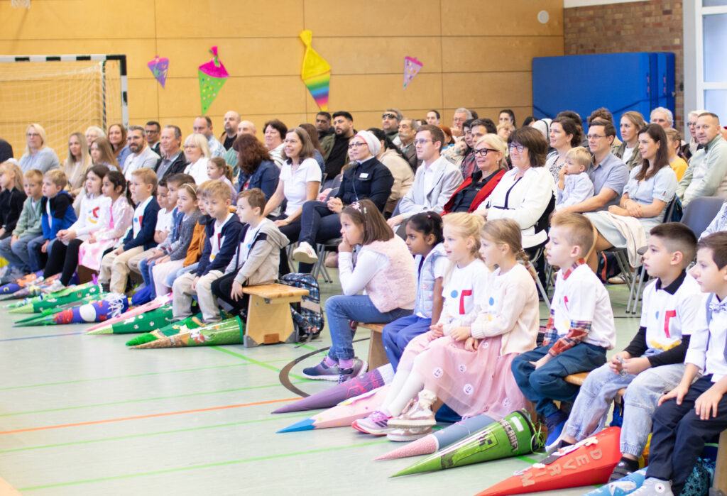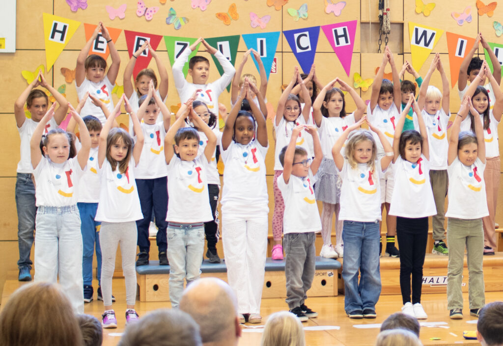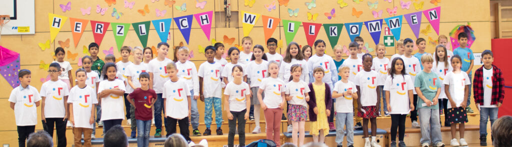 Mit dem Lied „Der erste Tag“ wurden die Erstklässler von den 2.Klassen bei der Feier in der Sporthalle begrüßt. Im Anschluss formulierten die Zweitklässler gute Wünsche für die Schulanfänger. Danach folgte ein tolles Mutmachlied mit dem Titel „Genauso wie ich bin“, das den Kindern die Botschaft mitgab, dass jeder richtig und willkommen ist – genauso wie er oder sie ist!