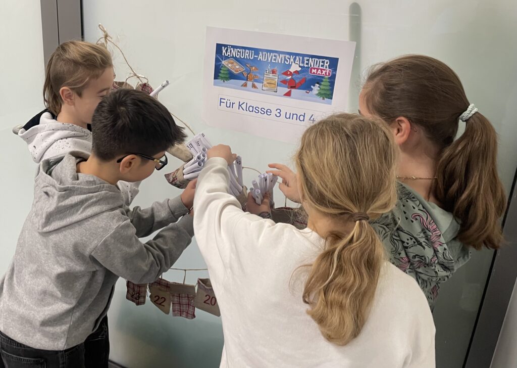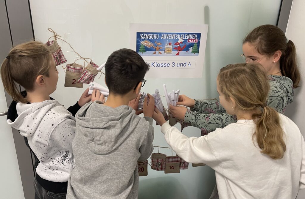 In den einzelnen Klassen gibt es zwei freiwillige Kinder, die den Känguru-Adventskalender-Dienst übernehmen, jeden Morgen die Tagesaufgabe aus dem Kalender abholen und wenn möglich in der eigenen Klasse vorstellen. Anschließend dürfen die Kinder gemeinsam in kleinen Gruppen an der Aufgabe knobeln. Besonders interessant ist es, die verschiedenen Herangehensweisen der Kinder im Klassengespräch in den Fokus zu setzen. Beim Vorstellen ihrer unterschiedlichen Lösungswege üben die Kinder sich besonders im Beschreiben und Begründen ihrer Ideen und lernen von- und miteinander.
